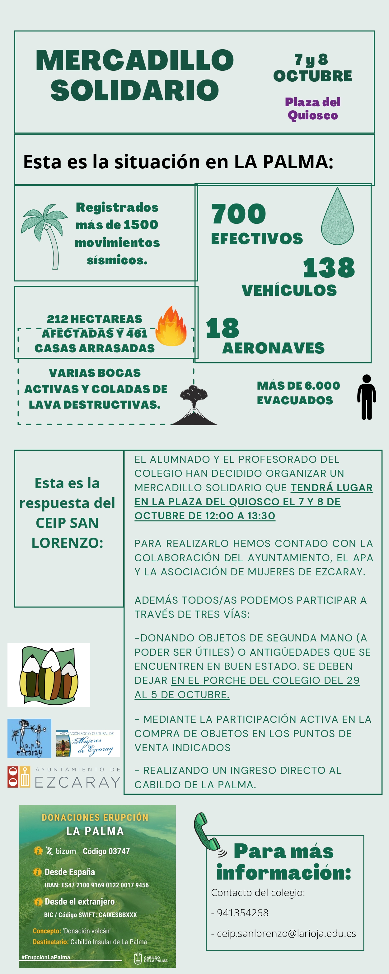 Nos complace anunciaros que la semana pasada logramos recaudar más de 3000 euros en el mercadillo solidario a favor de la isla de La Palma, concretamente recaudamos la cantidad de 3349 euros. Queremos hacer una mención especial de agradecimiento a Romina, por su participación tan activa con elementos de su tienda "Vísteme Despacio" gracias a la cual se recaudó mucha cantidad de dinero. Igualmente , el sorteo de las cestas que prepararon la Asociación de Mujeres de Ezcaray, tuvo un gran éxito y lograron recaudar más de 700 euros. Por otro lado hubo gestos de los vecinos del pueblo muy generosos, como por ejemplo el de una cuadrilla que llevaban 3 años vendiendo lotería y recaudando dinero para ellos, y decidieron donar todo el dinero que habían recaudado esos 3 años a través de nuestra acción, a La Palma. Sobretodo queremos agradecer a los/as alumnos/as implicados/as, las familias que han colaborado donando materiales o dinero y/o ayudando en la venta, profesores/as, APA, Ayuntamiento de Ezcaray y a toda la comunidad educativa.