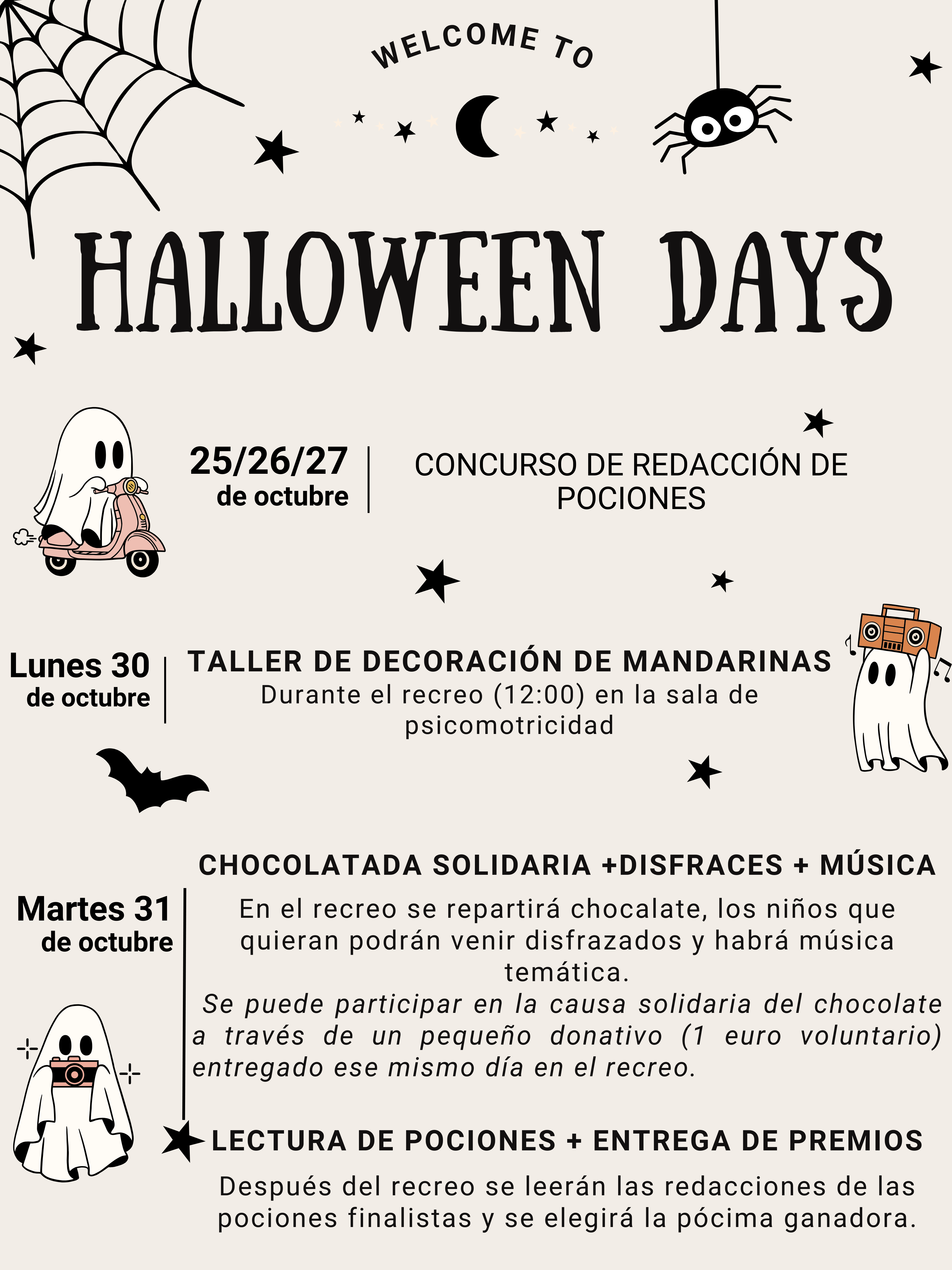 EL martes, habrá chocolatada solidaria y quien quiera puede venir disfrazado de algo relacionado con Haloween. Después del recreo, leeremos las pócimas seleccionadas en la biblioteca y se elegirá la pócima ganadora.