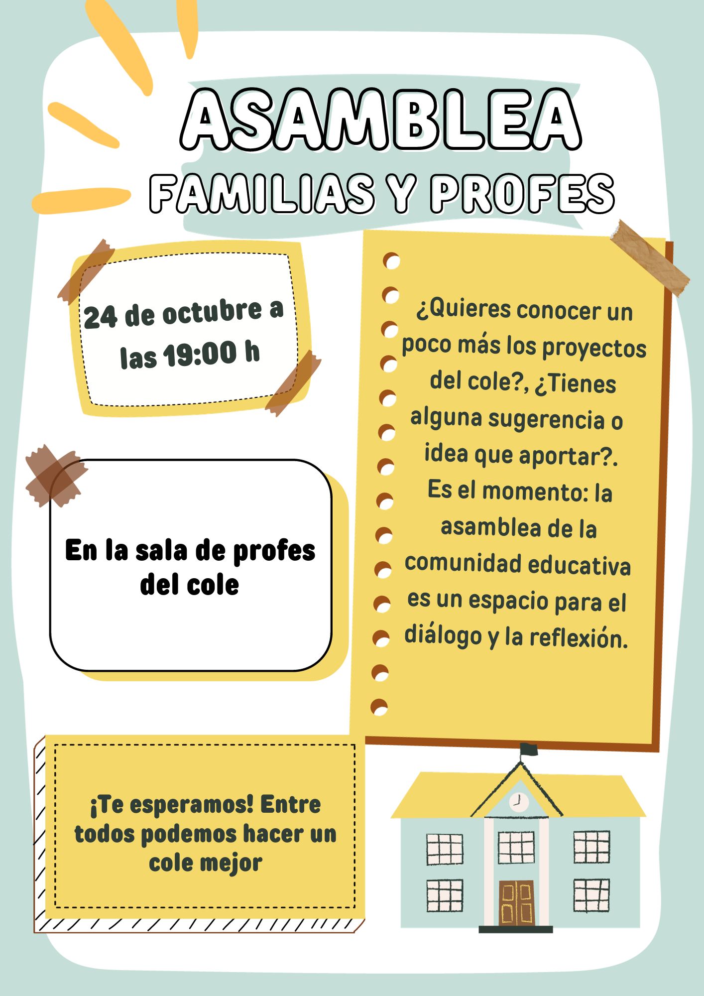 El próximo martes 24 de octubre se celebrará la primera asamblea de la comunidad educativa de este curso. Será a las 19:00h en el cole.
