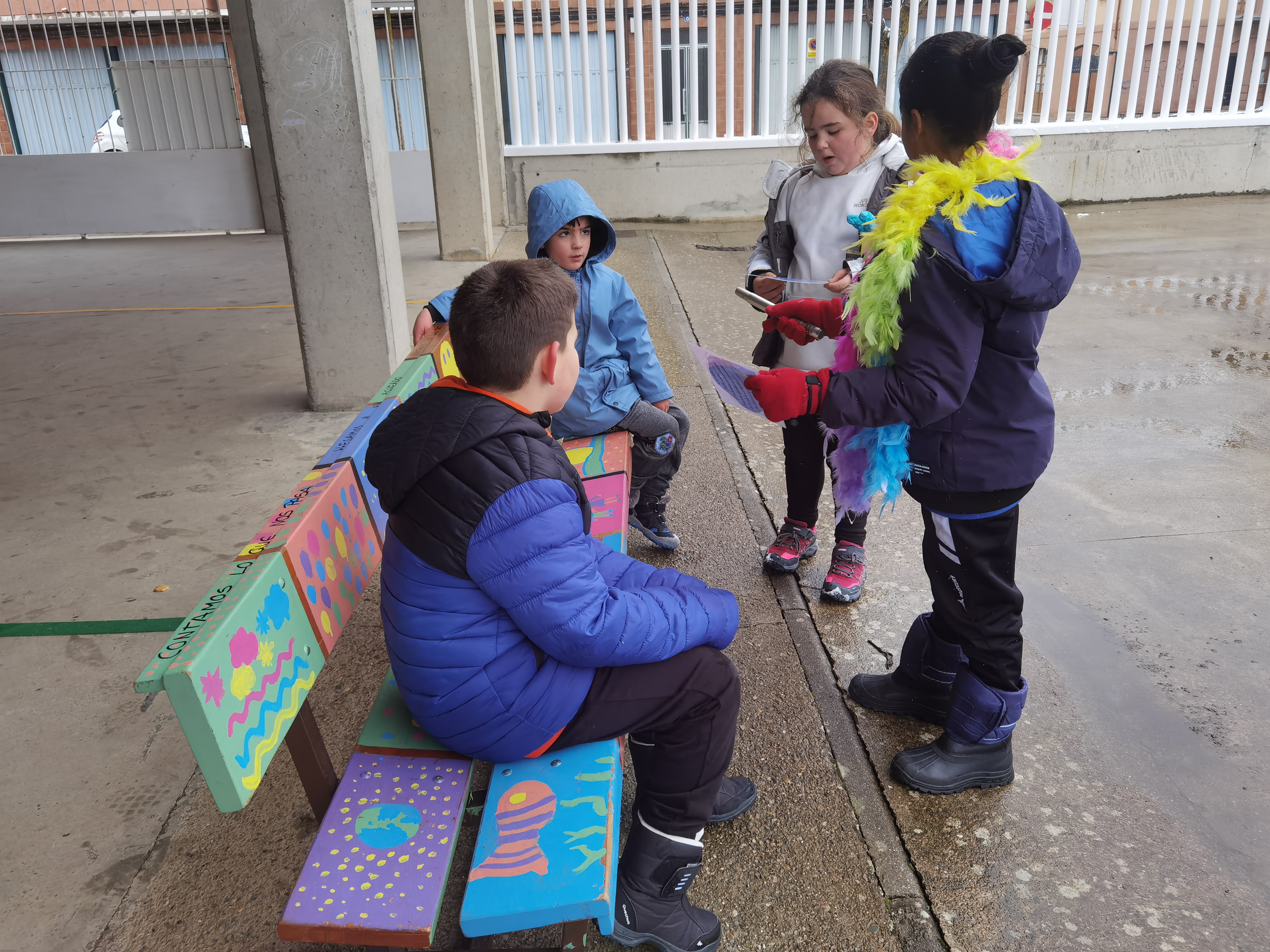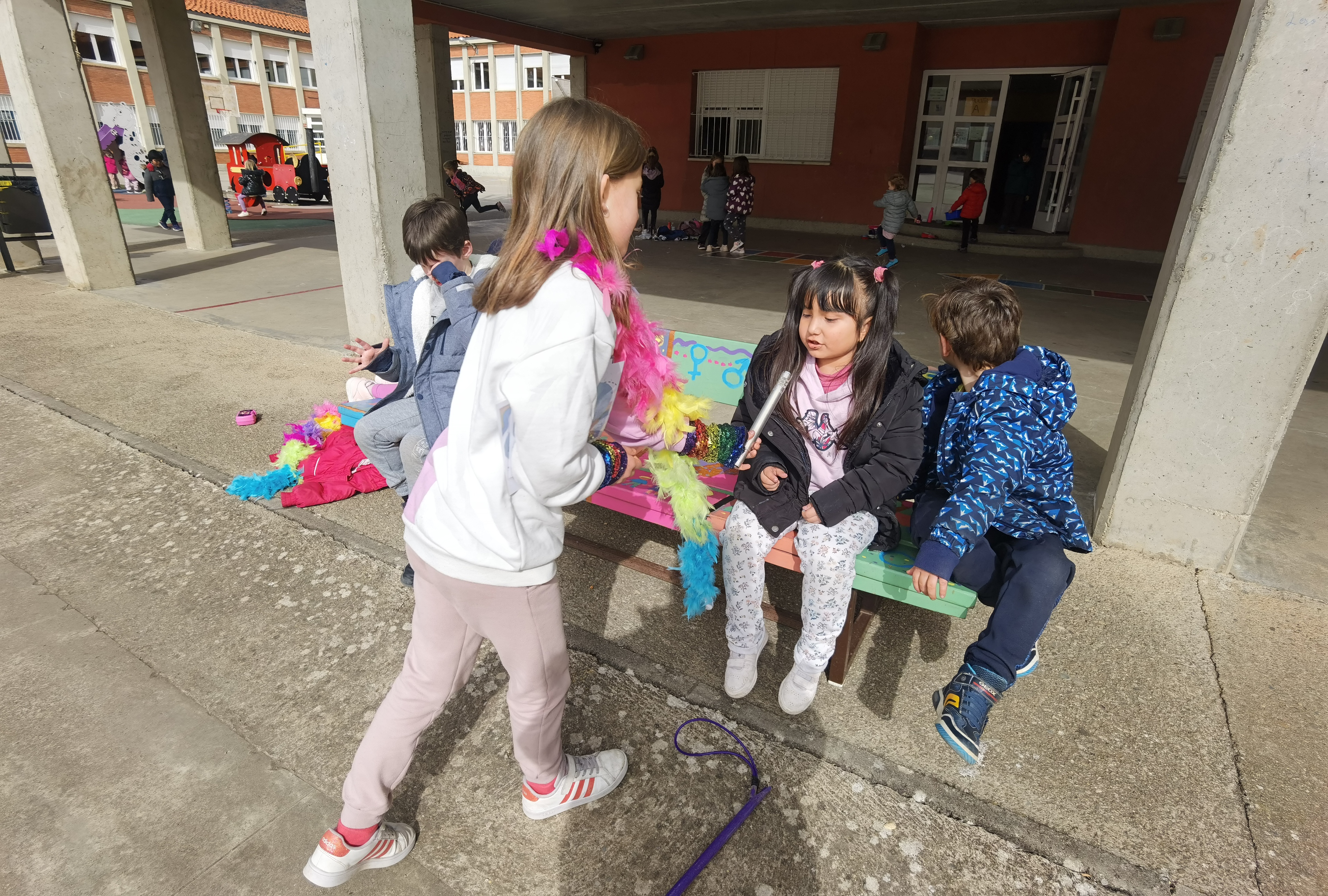 Relacionado con este tema, queremos contaros la nueva iniciativa que ha surgido desde los propios alumnos del Comité Ambiental (órgano de gobierno del cole compuesto por los alumnos del centro desde 3º hasta 6º de primaria). Tras el primer trimestre, valoraron que el proyecto de patios inclusivos tenía una necesidad. Los "vigilantes sociales" que tienen como rol encargarse de la gestión de materiales de juegos, de repartirlos y gestionar la devolución y además también tenían como rol ayudar en los conflictos que surgieran en el patio. Ellos detectaron que dichos vigilantes no podían encargarse de todo, no les daba tiempo y quisieron incluir el nuevo rol de "mediador del patio". Realizamos un grupo de voluntarios de 3º a 6º y dichos alumnos/as recibieron una pequeña formación durante dos días para saber como gestionar la mediación en los conflictos que surgieran. Es un aprendizaje continuo, ya que los problemas, que no son muchos, que surgen en el patio cada día, son distintos.