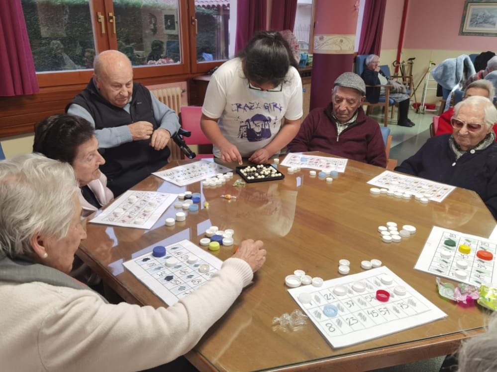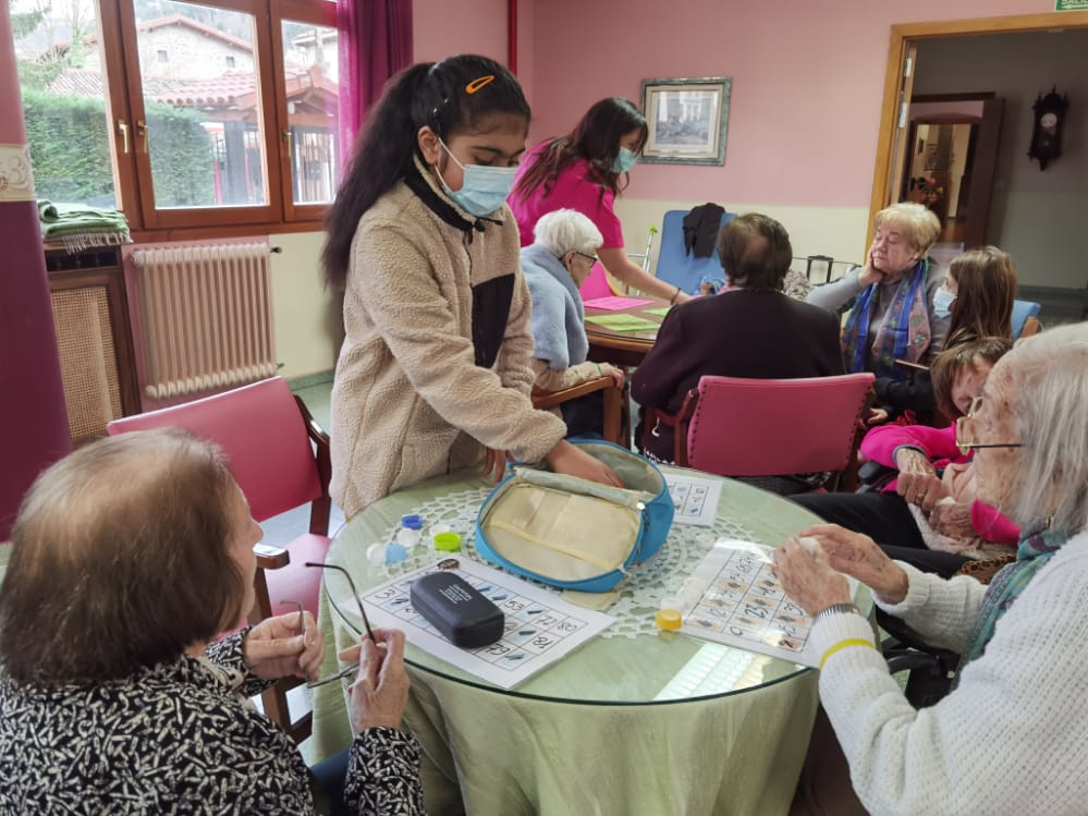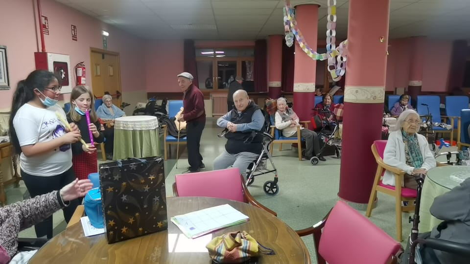 El viernes 20 de enero iniciamos este proyecto con 3 alumnas; Aliya, Lucía y Madelin. Danae les propuso ayudar a los/as abuelos/as con el juego del bingo. Aunque al principio estaban un poco cohibidas porque no habían hecho "este trabajo" nunca, al final acabaron dominando la situación, interactuando con todos/as los/as abuelos/as y consiguieron incluso que todos/as los/as que normalmente no querían jugar, se unieran. Además, sintiéndose ya como en casa, las alumnas terminaron dando un concierto de flauta y las personas de la residencia cantaron para ellas unas jotas y canciones tradicionales que tan buenos recuerdos les traen. Aunque la idea inicial era que pasaran una hora de voluntariado, finalmente estuvieron 2 horas.