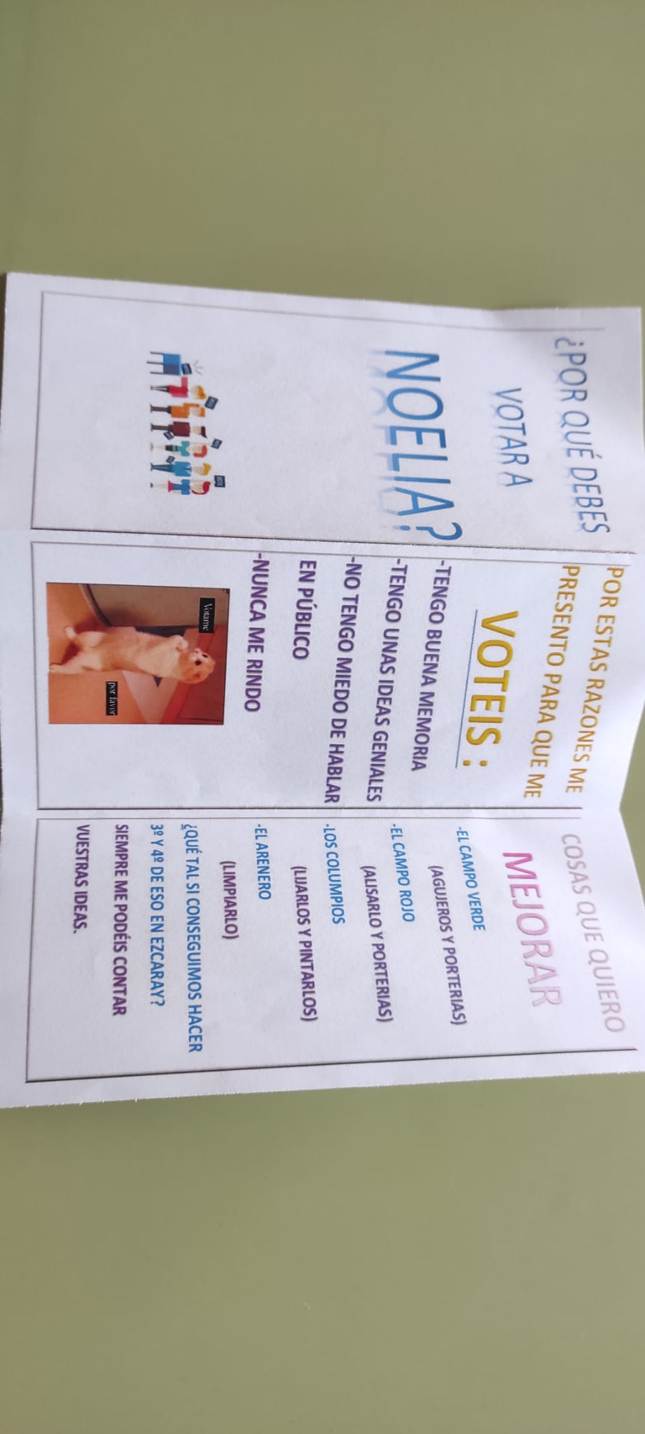 El pasado martes 22 de octubre, tuvieron lugar las elecciones de alumnos/as y padres/madres al Consejo Escolar. Los 4 candidatos de 5º que quieren formar parte del Consejo Escolar realizaron sus propias propagandas electorales e incluso hablaron con el resto de alumnos/as para conseguir votos. La participación de los peques fue masiva y finalmente salió elegida Noelia.